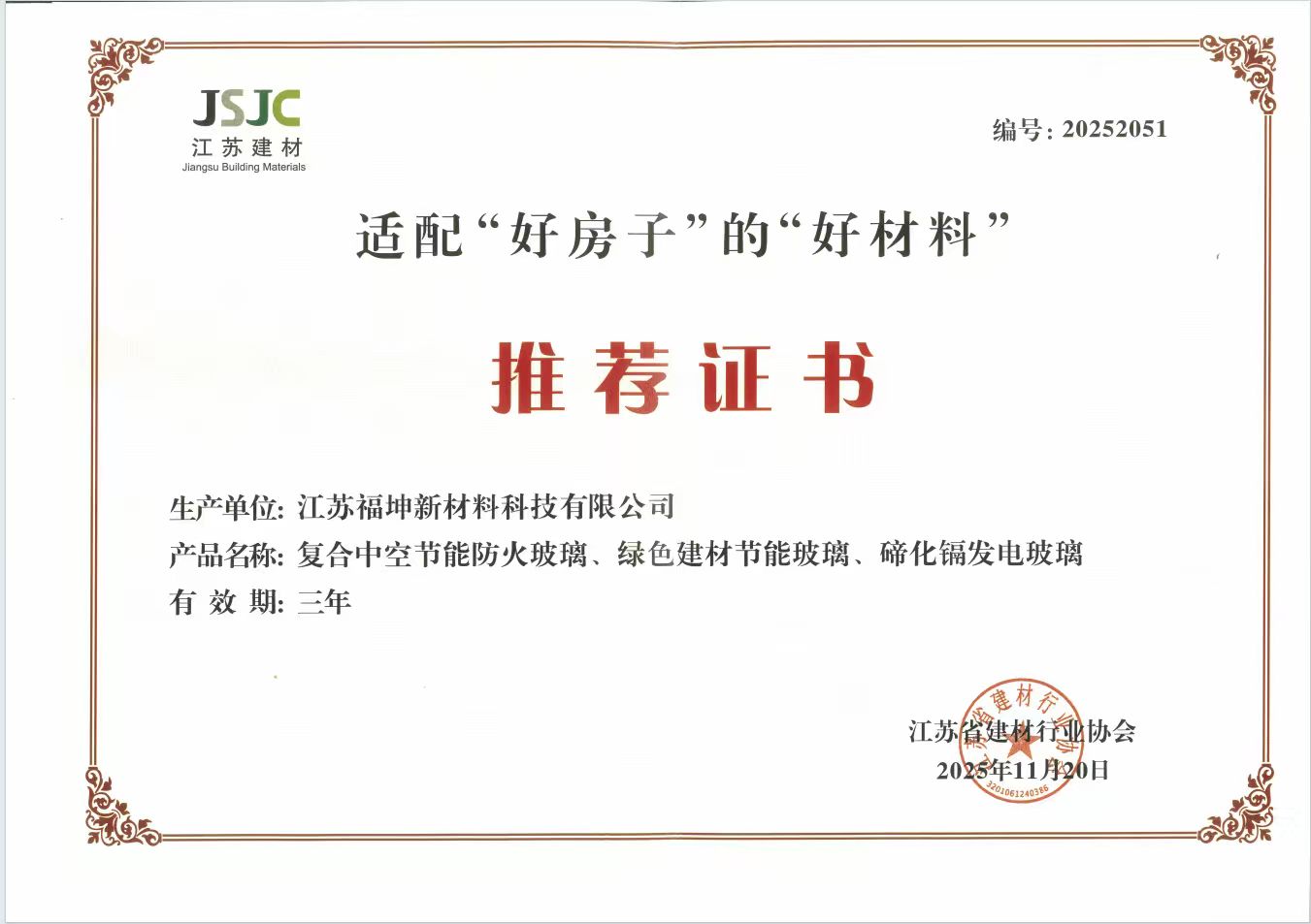 近日,我司的復合中空節能防火玻璃、綠色建材節能玻璃、碲化鎘發電玻璃三款產品,成功入選江蘇省建材行業協會“適配‘好房子’的‘好材料’”推薦名單,并獲頒推薦證書(編號:20252051),有效期三年。