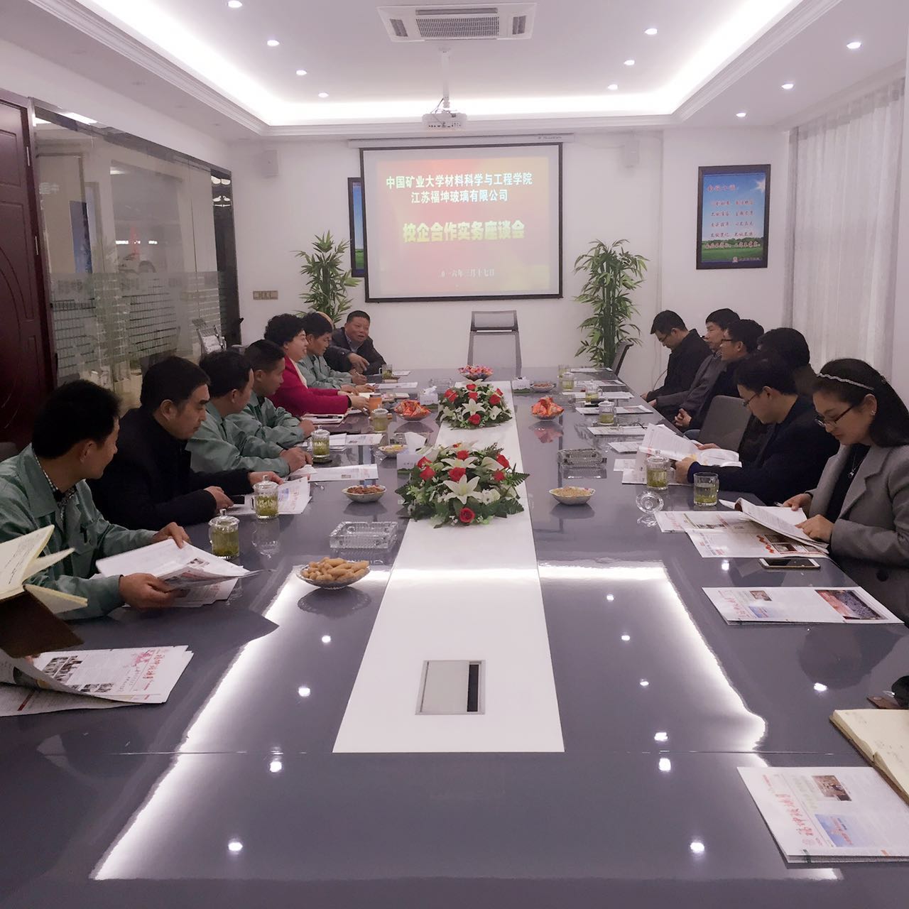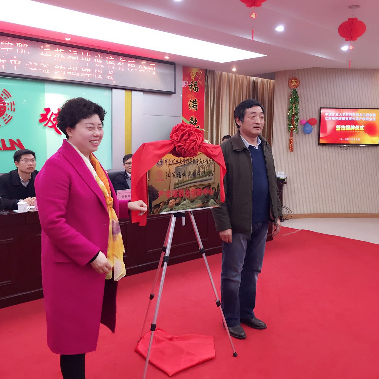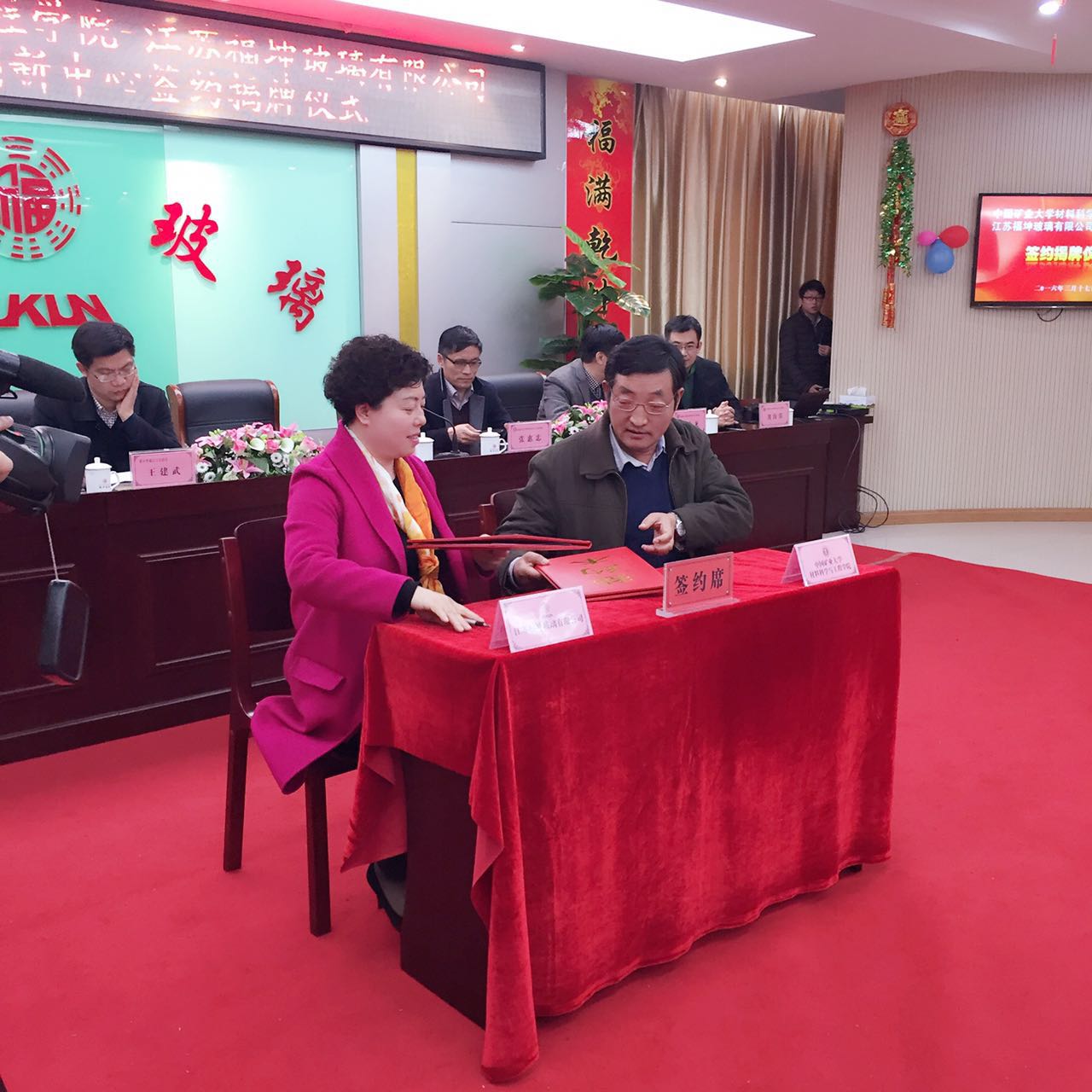 2016年3月17日下午,江蘇福坤玻璃有限公司與中國礦業(yè)大學材料科學與工程學院在福坤西廠五樓多功能廳進行產學研聯(lián)合創(chuàng)新部簽約及揭牌儀式。雙方宣布將本著相互協(xié)作、共同發(fā)展的精神,在優(yōu)勢互補、互助互利、共同發(fā)展的基礎上,共同建立“中國礦業(yè)大學材料科學與工程學院——江蘇福坤玻璃有限公司產學研聯(lián)合創(chuàng)新部”,實現(xiàn)“校企合作、產學雙贏”。江蘇福坤玻璃董事長、總經理洪愛萍,中國礦業(yè)大學材料科學與工程學院強穎懷院長、張惠忠書 記、劉金龍副院長、劉海明副 書 記、郭立童、陶雪鈺教 授、泰興市城區(qū)工業(yè)園區(qū)王建武主任、泰興市科技局戴國廣副局長、以及泰興電視臺和泰興日報社的嘉賓朋友們出席了簽約儀式,洪愛萍總經理和強穎懷院長共同揭牌,正式拉開了福坤玻璃與中國礦業(yè)大學的全 面合作新篇章。