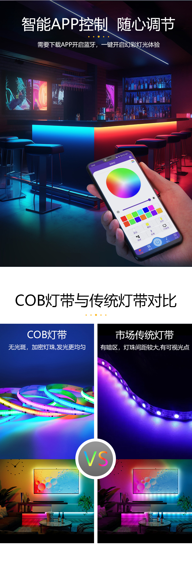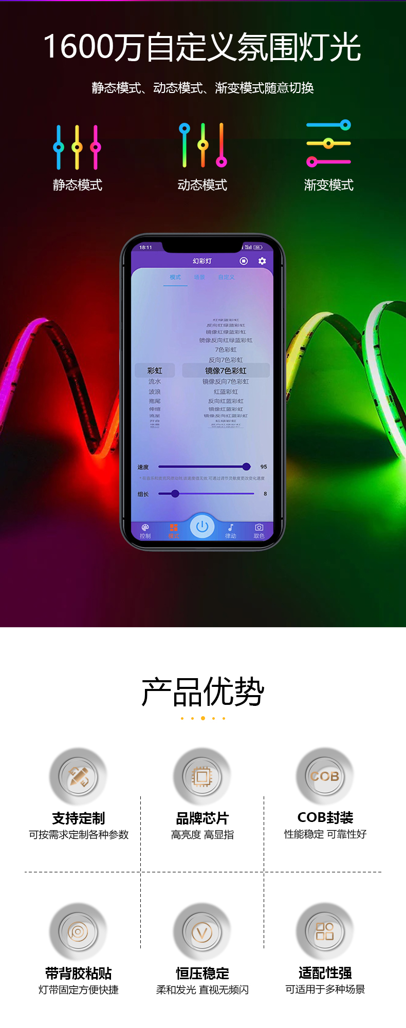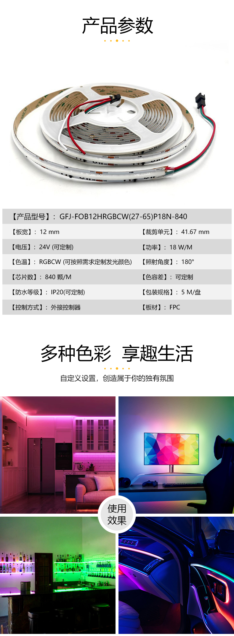熱門標簽: 12mmRGBCW五色合一幻彩跑馬流水COB燈帶無斑點遙控式柔性氛圍燈帶