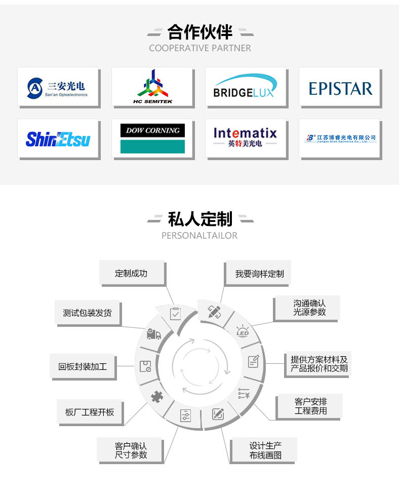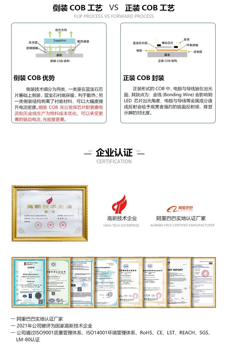 1、采用倒裝LED封裝,自主研發新型焊接工藝使晶片與基本連接更牢固、可靠性好、死燈 率大大降低;